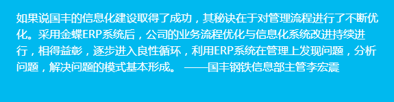 國豐鋼鐵通過ERP實施,達到產銷一體化管理的效果,有效縮短交貨期,提高了交貨準時率,全面提高企業的市場響應速度和應變能力。