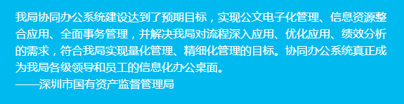 深圳市國資局借助金蝶協同系統規范了辦文流程,實現對各處室辦文過程的督辦,達到工作量化考核;同時加強機關內部工作進展、上會、接待等事務管理;實現信息資源共享,提高內部信息資源的利用效率。
